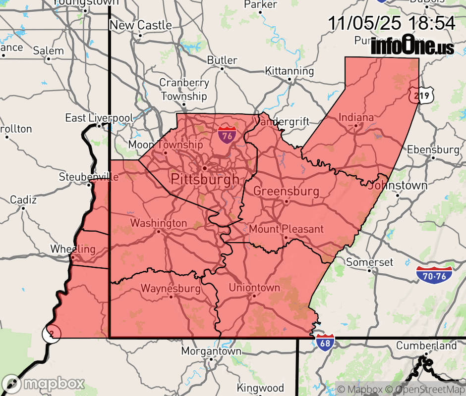 Canceled 11/5/25 8:00 PM Special Weather Statement issued November 5 at 6:50PM EST by NWS Pittsburgh PA At 6:50 PM, a few short lines of showers, with an occasional stroke or two of lightning, were moving east-southeast at 50 MPH across portions of southwest Pennsylvania and the northern West Virginia panhandle. Along with brief heavy rain, surface wind gusts of 45 to 55 MPH will be possible in the stronger showers and storms along this line. These wind gusts could cause some tree damage, as well as isolated power outages. Remain inside a sturdy structure when this line approaches your area. ![]() |
