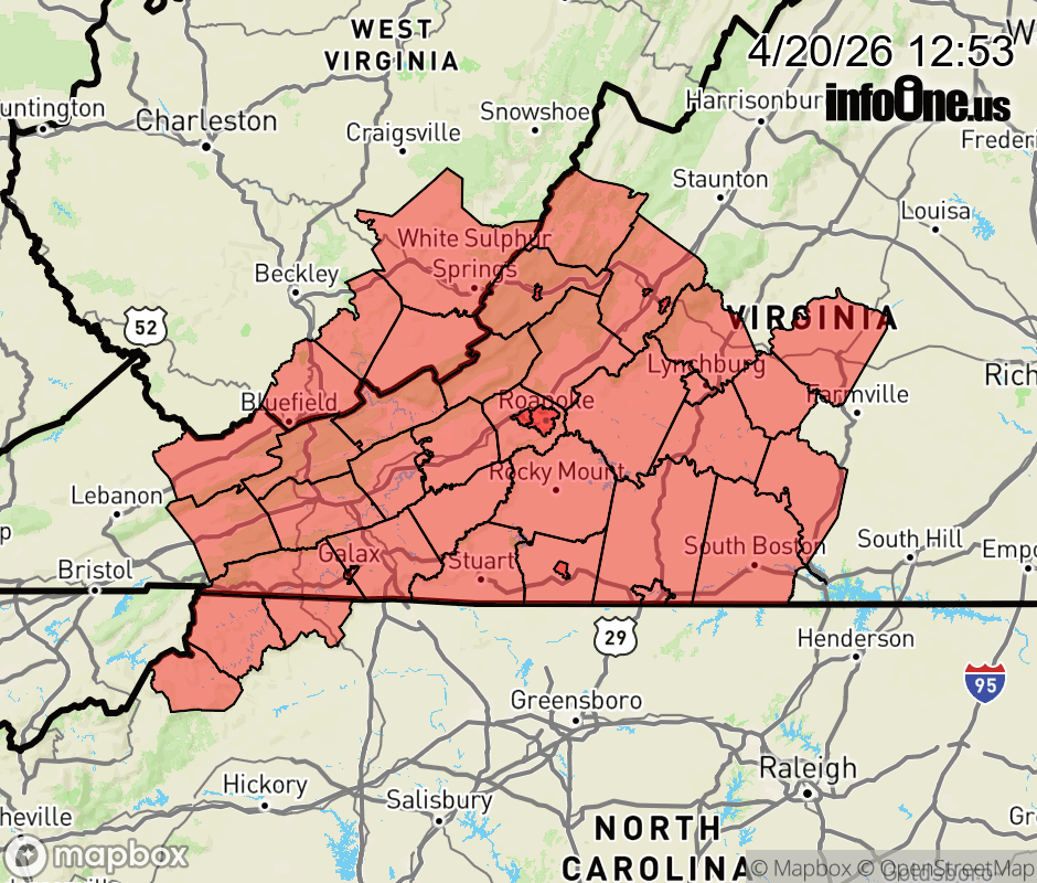 Freeze Warning issued April 20 at 12:51PM EDT until April 21 at 9:00AM EDT by NWS Blacksburg VA * WHAT... Temperatures in the mid to upper 20s expected. * WHERE... Portions of northwest North Carolina, southwest Virginia, and southeast West Virginia. * WHEN... From midnight tonight to 9 AM EDT Tuesday. * IMPACTS... Frost and freeze conditions could kill crops and other sensitive vegetation, and they may possibly damage unprotected outdoor plumbing. ![]() |