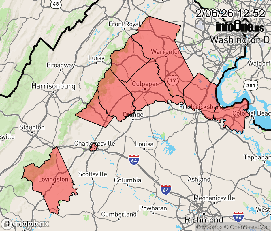 Canceled 2/6/26 3:58 PM Wind Advisory issued February 6 at 12:51PM EST until February 7 at 7:00PM EST by NWS Baltimore MD/Washington DC * WHAT... For the Cold Weather Advisory, very cold wind chills as low as 8 degrees below zero expected. For the Wind Advisory, northwest winds 20 to 30 mph with gusts up to 55 mph expected. * WHERE... Albemarle, Greene, King George, Nelson, Culpeper, Southern Fauquier, Stafford, Madison, and Rappahannock Counties. * WHEN... For the Cold Weather Advisory, from 4 AM Saturday to 10 AM EST Sunday. For the Wind Advisory, from 4 AM to 7 PM EST Saturday. * IMPACTS... Gusty winds will blow around unsecured objects. Tree limbs could be blown down and a few power outages may result. The cold wind chills as low as 10 below zero could result in hypothermia if precautions are not taken. * ADDITIONAL DETAILS... Wind chills will remain at or below zero during the day on Saturday due to windy conditions and cold temperatures. ![]() |
