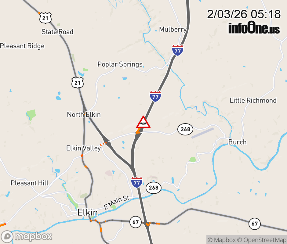 The ramp is closed at Exit 85 (NC 268). Updated: Tue 2/3/26 5:18 AM EST ![]() Updated: Tue 2/3/26 5:18 AM EST |