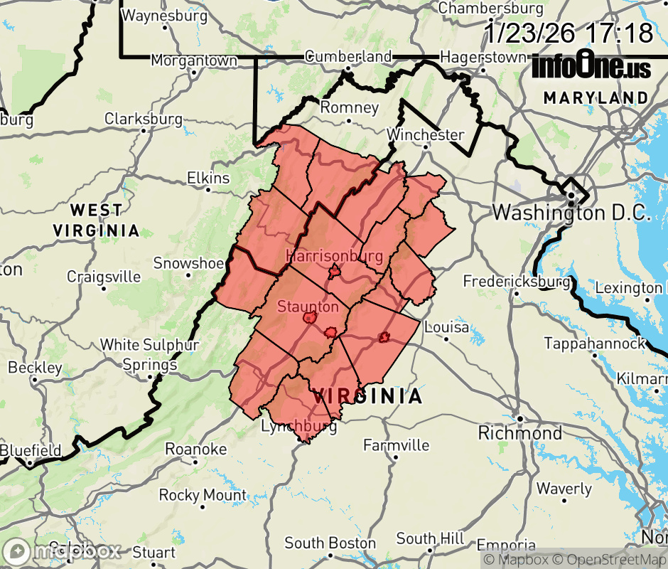 Winter Storm Warning issued January 23 at 5:16PM EST until January 26 at 1:00AM EST by NWS Baltimore MD/Washington DC ...MAJOR WINTER STORM WILL IMPACT THE REGION SATURDAY EVENING THROUGH SUNDAY EVENING... .A large area of precipitation will overrun Arctic air in place over the Mid-Atlantic. This will lead to widespread significant snow beginning Saturday evening, with the potential for ice Sunday especially south of Highway 50 and near and east of Interstate 95. In addition to the high threat for significant snow and ice, very cold temperatures are expected tonight through the middle of next week with sub-zero wind chills likely at times. * WHAT... Heavy mixed precipitation expected. Total snow and sleet accumulations between 8 and 14 inches, with highest amounts west of the Blue Ridge and especially into eastern WV. Ice accumulations of one to two tenths, mainly south of US-33, and up to one quarter inch of ice accumulation is possible along the Blue Ridge. * WHERE... Portions of central, northwest, and western Virginia and eastern West Virginia. * WHEN... From 7 PM Saturday to 1 AM EST Monday. * IMPACTS... Power outages and tree damage are likely due to the ice. Travel could be nearly impossible. * ADDITIONAL DETAILS... Snow will likely overspread the area by Saturday night, becoming heavy at times with rates of one to two inches per hour possible at times. A mix with sleet or freezing rain is expected Sunday, especially south of Interstate 70. Significant icing is possible especially across central Virginia. Visibility of one-quarter mile or less is possible at times. A prolonged period of wind chills in the teens and single digits is likely beginning this evening and lasting through the middle of next week, with sub-zero wind chills possible at times. ![]() |