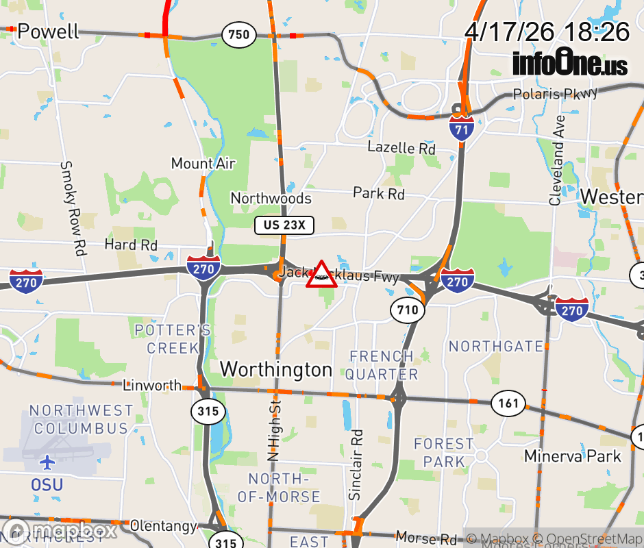 The right shoulder is blocked on I-270 East beyond US-23, due to a crash. Updated: Fri 4/17/26 6:26 PM EDT ![]() Updated: Fri 4/17/26 6:26 PM EDT |