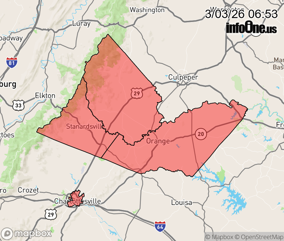 Canceled 3/3/26 9:46 AM Winter Weather Advisory issued March 3 at 6:51AM EST until March 3 at 10:00AM EST by NWS Baltimore MD/Washington DC * WHAT... Freezing rain. Additional ice accumulations around a light glaze, especially on elevated surfaces. * WHERE... Albemarle, Greene, Orange, and Madison Counties. * WHEN... Until 10 AM EST this morning. * IMPACTS... Elevated surfaces such as decks, stairs, and bridges may be icy in some locations. The hazardous conditions could impact the Tuesday morning commute. * ADDITIONAL DETAILS... Precipitation will taper off and temperatures will rise above freezing by mid morning. ![]() |