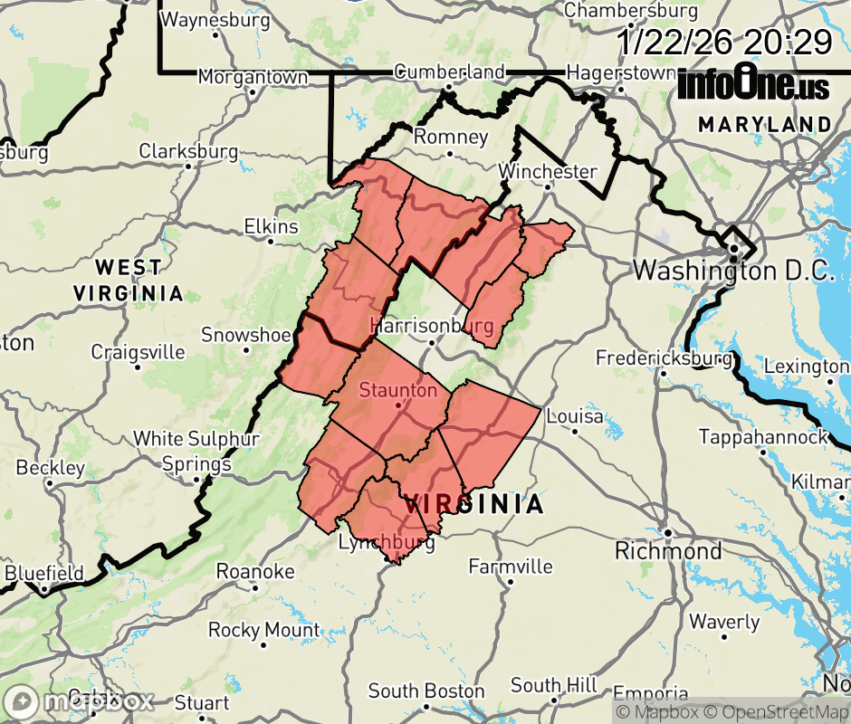 Canceled 1/23/26 3:40 AM Cold Weather Advisory issued January 22 at 8:27PM EST until January 24 at 10:00AM EST by NWS Baltimore MD/Washington DC * WHAT... Very cold wind chills of 10 to 15 below expected. * WHERE... In Virginia, Central Virginia Blue Ridge, and Page, Shenandoah, Warren, Eastern Highland, and Western Highland Counties. In West Virginia, Eastern Grant, Eastern Pendleton, Hardy, and Western Pendleton Counties. * WHEN... From 8 PM Friday to 10 AM EST Saturday. * IMPACTS... The dangerously cold wind chills as low as 15 below zero could cause frostbite on exposed skin in as little as 30 minutes. ![]() |