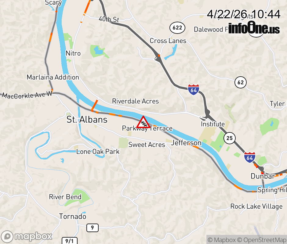Road Closure on US-60 MacCorkle Ave from Roxbury St South Charleston to Walnut St Saint Albans. Updated: Wed 4/22/26 10:44 AM EDT ![]() Updated: Wed 4/22/26 10:44 AM EDT |