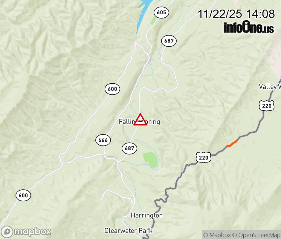 On Rt. 687 in the County of Alleghany, in the vicinity of Falls Rd; Rt. 640E/W (Alleghany County), motorists can expect delays due to a vehicle crash. All north lanes are closed. All south lanes are closed. ![]() |