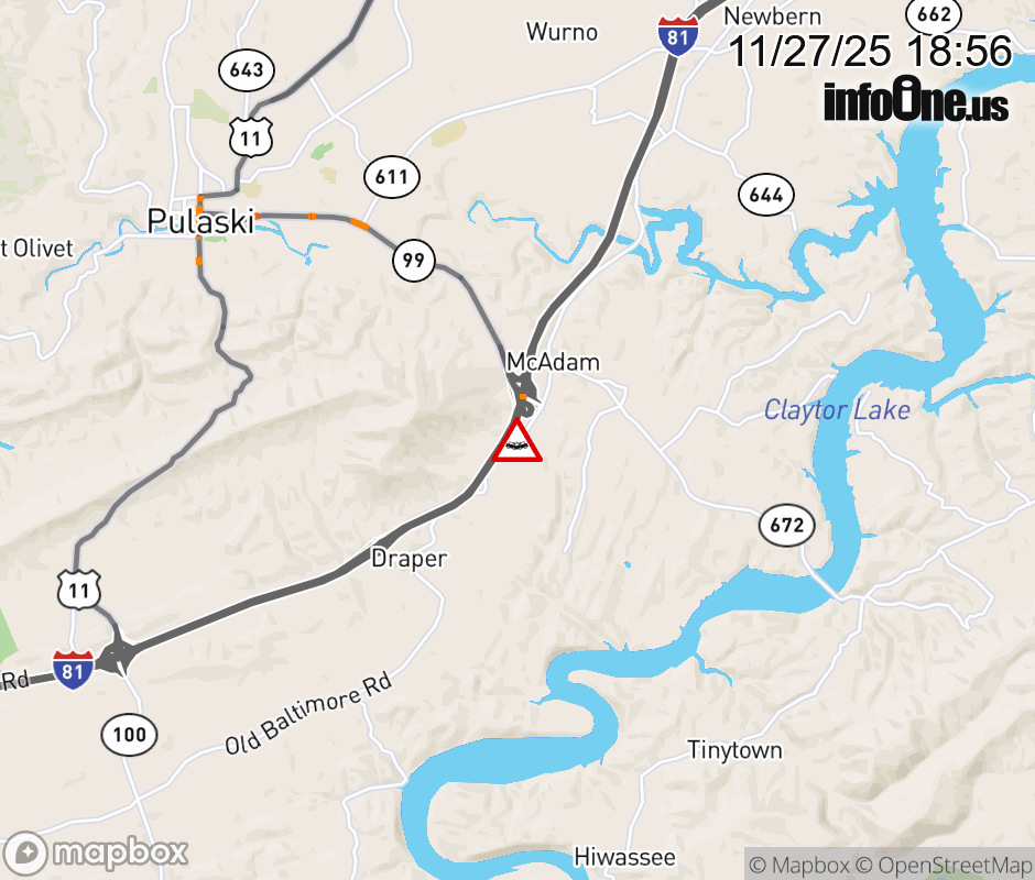 On VA-47 in the County of Pulaski, in the vicinity of the ramp from I-81N, motorists can expect delays due to a vehicle crash. The west left shoulder and left lane are closed. ![]() |
