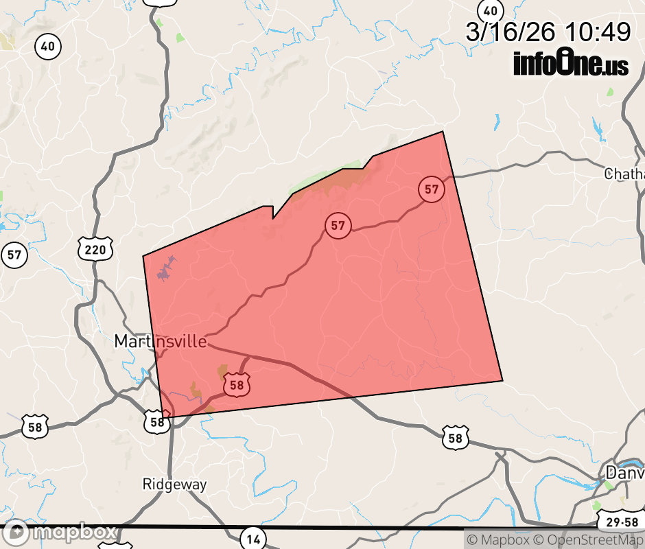Canceled 3/16/26 11:01 AM Tornado Warning issued March 16 at 10:48AM EDT until March 16 at 11:15AM EDT by NWS Blacksburg VA TORRNK The National Weather Service in BLACKSBURG has issued a * Tornado Warning for... Southwestern Pittsylvania County in south central Virginia... The City of Martinsville in south central Virginia... Northeastern Henry County in south central Virginia... * Until 1115 AM EDT. * At 1047 AM EDT, a severe thunderstorm capable of producing a tornado was located over Laurel Park, or over Martinsville, moving east at 35 mph. HAZARD...Tornado. SOURCE...Radar indicated rotation. IMPACT...Flying debris will be dangerous to those caught without shelter. Mobile homes will be damaged or destroyed. Damage to roofs, windows, and vehicles will occur. Tree damage is likely. * Locations impacted include... Martinsville... Axton... Callands... Swansonville... Leatherwood... Chatmoss... and Sandy River. ![]() |