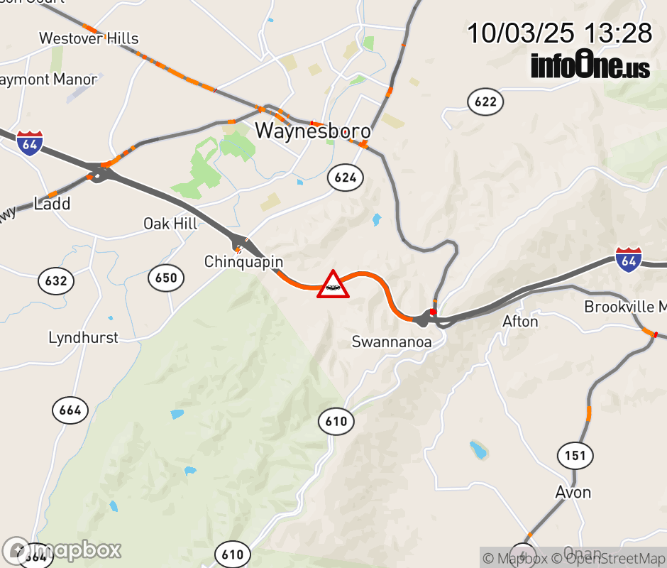 On I-64 East at mile marker 98.2 in the County of Augusta, motorists can expect delays due to a vehicle crash. Updated: Fri 10/3/25 1:28 PM EDT ![]() Updated: Fri 10/3/25 1:28 PM EDT |
