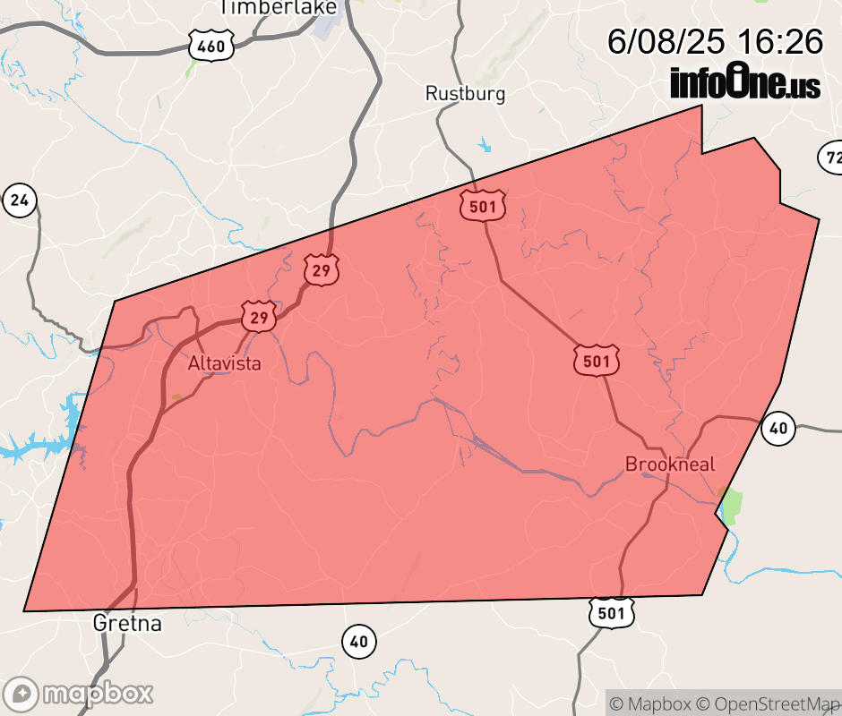 Canceled 6/8/25 4:46 PM Severe Thunderstorm Warning issued June 8 at 4:25PM EDT until June 8 at 5:30PM EDT by NWS Blacksburg VA SVRRNK The National Weather Service in BLACKSBURG has issued a * Severe Thunderstorm Warning for... Southern Campbell County in central Virginia... Northeastern Pittsylvania County in south central Virginia... Northwestern Halifax County in south central Virginia... * Until 530 PM EDT. * At 424 PM EDT, a severe thunderstorm was located near Hurt, moving east at 25 mph. HAZARD...60 mph wind gusts and quarter size hail. SOURCE...Radar indicated. IMPACT...Hail damage to vehicles is expected. Expect wind damage to roofs, siding, and trees. * Locations impacted include... Altavista... Hurt... Brookneal... Hodges... Cody... Mike... and Hat Creek. ![]() |