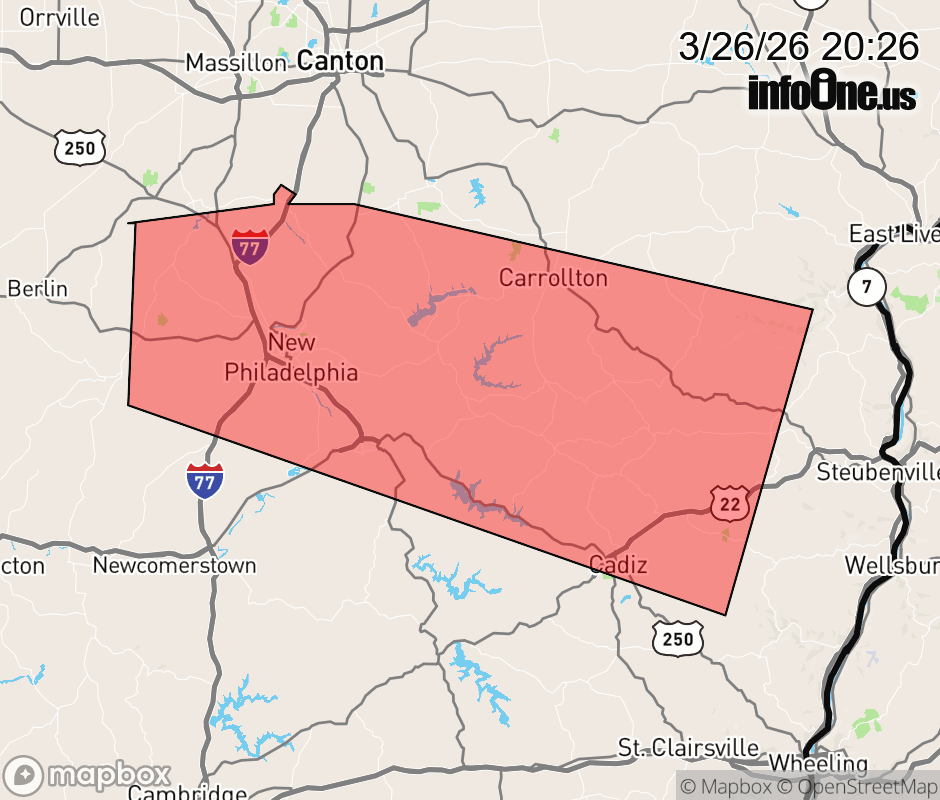 Canceled 3/26/26 8:42 PM Severe Thunderstorm Warning issued March 26 at 8:24PM EDT until March 26 at 9:15PM EDT by NWS Pittsburgh PA SVRPBZ The National Weather Service in Pittsburgh has issued a * Severe Thunderstorm Warning for... Southern Carroll County in east central Ohio... Northern Harrison County in east central Ohio... Western Jefferson OH County in east central Ohio... Tuscarawas County in east central Ohio... * Until 915 PM EDT. * At 824 PM EDT, a severe thunderstorm was located 6 miles north of Sugarcreek, or 10 miles northwest of Dover, moving east at 50 mph. HAZARD...Quarter size hail. SOURCE...Radar indicated. IMPACT...Damage to vehicles is expected. * Locations impacted include... New Philadelphia, Dover, Uhrichsville, Cadiz, Carrollton, Dennison, Strasburg, Sugarcreek, Tuscarawas, Bolivar, Hopedale, Scio, Midvale, Mineral City, Jewett, Bergholz, Amsterdam, Richmond, Bowerston and Barnhill. ![]() |