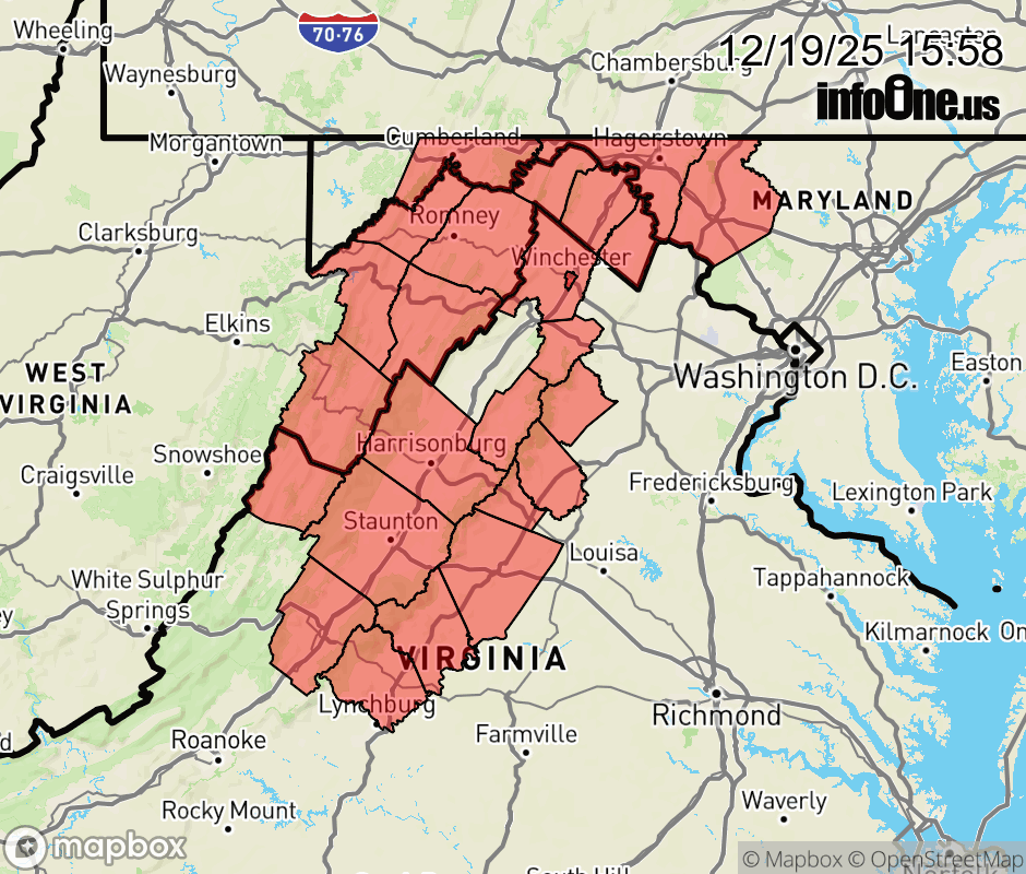 Canceled 12/19/25 4:47 PM High Wind Warning issued December 19 at 3:57PM EST until December 19 at 10:00PM EST by NWS Baltimore MD/Washington DC * WHAT... West winds 25 to 35 mph with gusts of 60 to 65 mph. * WHERE... Portions of north-central and western Maryland, central, northwest, and western Virginia, and eastern West Virginia. * WHEN... Until 10 PM EST this evening. * IMPACTS... Damaging winds will blow down trees and power lines. Widespread power outages are expected. Travel will be difficult, especially for high profile vehicles. ![]() |