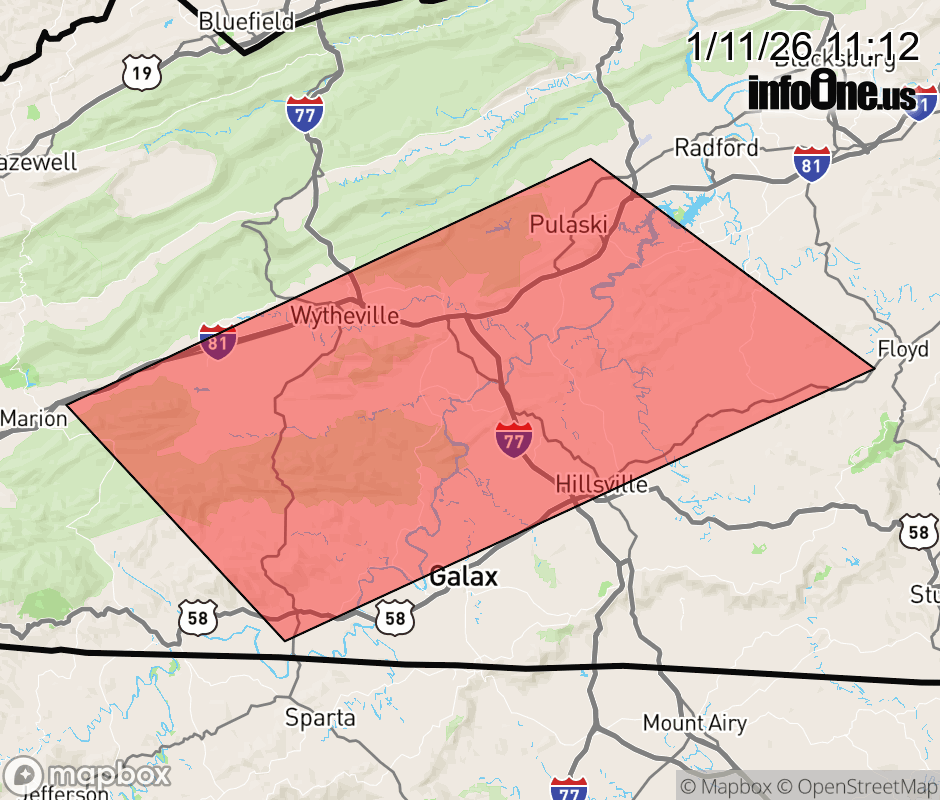 Canceled 1/11/26 12:00 PM Snow Squall Warning issued January 11 at 11:10AM EST until January 11 at 12:00PM EST by NWS Blacksburg VA The National Weather Service in BLACKSBURG has issued a * Snow Squall Warning for... Southern Pulaski County in southwestern Virginia... East central Smyth County in southwestern Virginia... West central Floyd County in southwestern Virginia... Wythe County in southwestern Virginia... Northern Carroll County in southwestern Virginia... Eastern Grayson County in southwestern Virginia... * Until noon EST. * At 1109 AM EST, a dangerous snow squall was located along a line extending from near Pulaski to Atkins, moving southeast at 30 mph. HAZARD...Intense bursts of heavy snow. Gusty winds leading to blowing snow and visibility rapidly falling to one quarter of a mile. Wind gusts up to 35 mph. SOURCE...Radar indicated. IMPACT...Dangerous and life-threatening travel conditions are expected to develop rapidly in the warning area. This snow squall will impact Interstate 77 and Interstate 81. Locations impacted include... Pulaski... Wytheville... Galax... Hillsville... Rural Retreat... Independence... and Fries. ![]() |