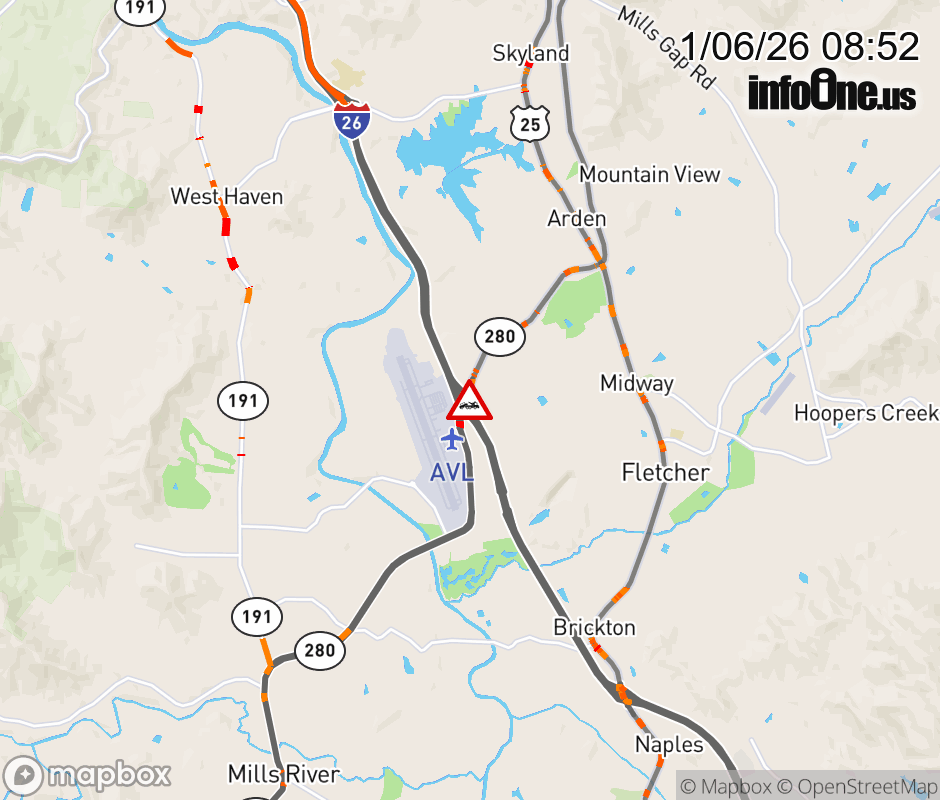 Exit 40 ramp is narrowed at NC 280 (Airport Road). Updated: Tue 1/6/26 8:52 AM EST ![]() Updated: Tue 1/6/26 8:52 AM EST |