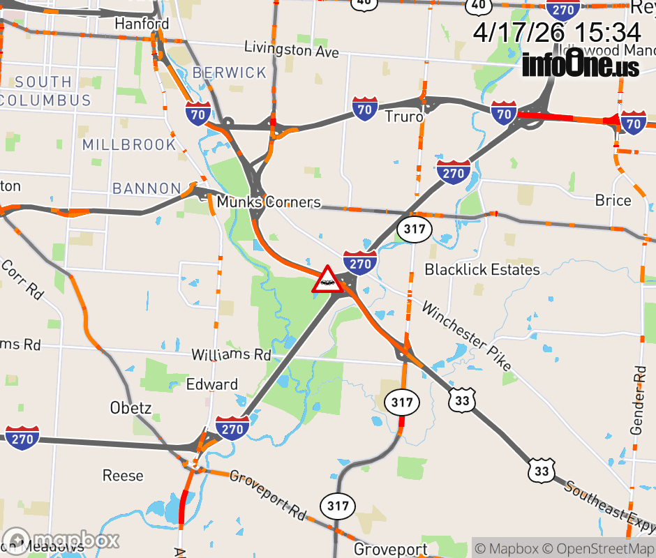 The right shoulder is blocked on US-33 East at I-270 South, due to a crash. Updated: Fri 4/17/26 3:34 PM EDT ![]() Updated: Fri 4/17/26 3:34 PM EDT |