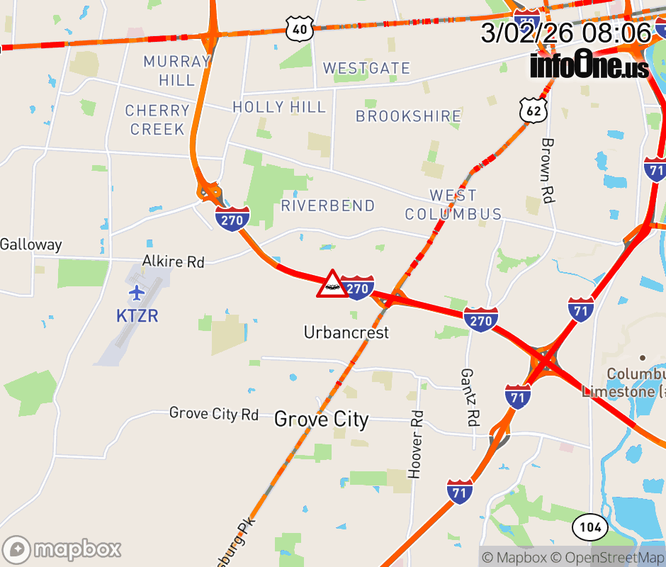 Expect lane closures on I-270 West beyond US-62/Harrisburg Pike, due to a crash. ![]() |
