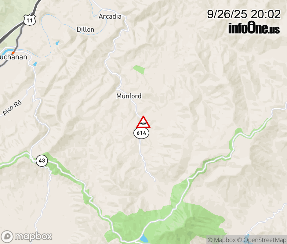 On Rt. 614 North in the County of Botetourt, in the vicinity of Chestnut Run Rd; Rt. 618E/W (Botetourt County), motorists can expect delays due to a vehicle crash. Lane closures exist. ![]() |