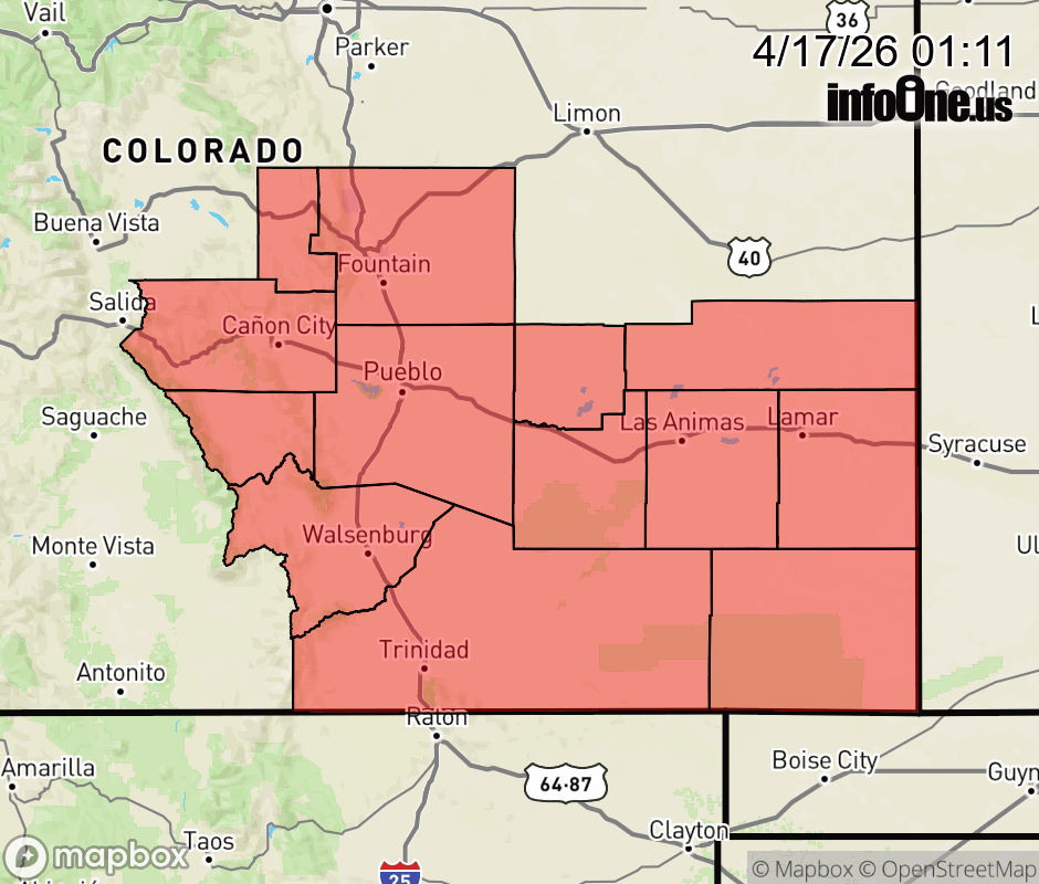 Freeze Watch issued April 16 at 11:08PM MDT until April 19 at 8:00AM MDT by NWS Pueblo CO * WHAT... For the Freeze Warning, sub-freezing temperatures in the teens on Monument Hill to the 20s across the remainder of the southeast plains. For the Freeze Watch, sub-freezing temperatures in the mid 20s to lower 30s possible. * WHERE... All of the southeast plains. * WHEN... For the Freeze Warning, from 10 PM Friday to 8 AM MDT Saturday. For the Freeze Watch, from Saturday evening through Sunday morning. * IMPACTS... Freeze conditions will kill sensitive vegetation and damage unprotected outdoor plumbing, including sprinkler systems and swamp coolers. ![]() |