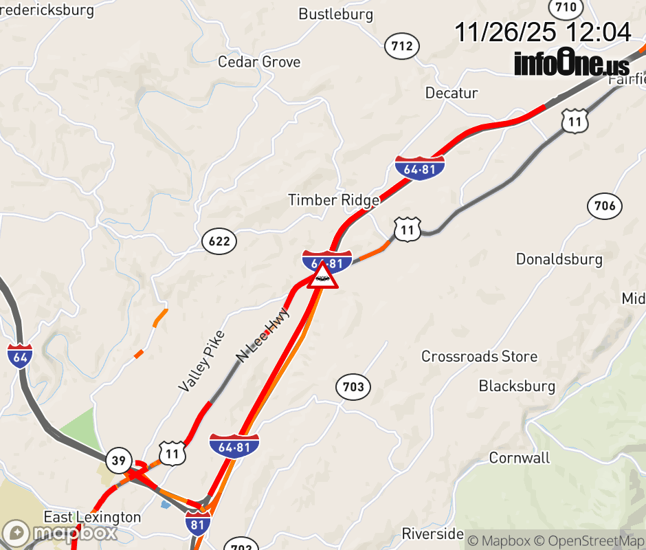 On I-81 South at mile marker 195 in the County of Rockbridge, motorists can expect delays due to a vehicle crash. Traffic backups are approximately 1.0 mile. Updated: Wed 11/26/25 12:04 PM EST ![]() Updated: Wed 11/26/25 12:04 PM EST |