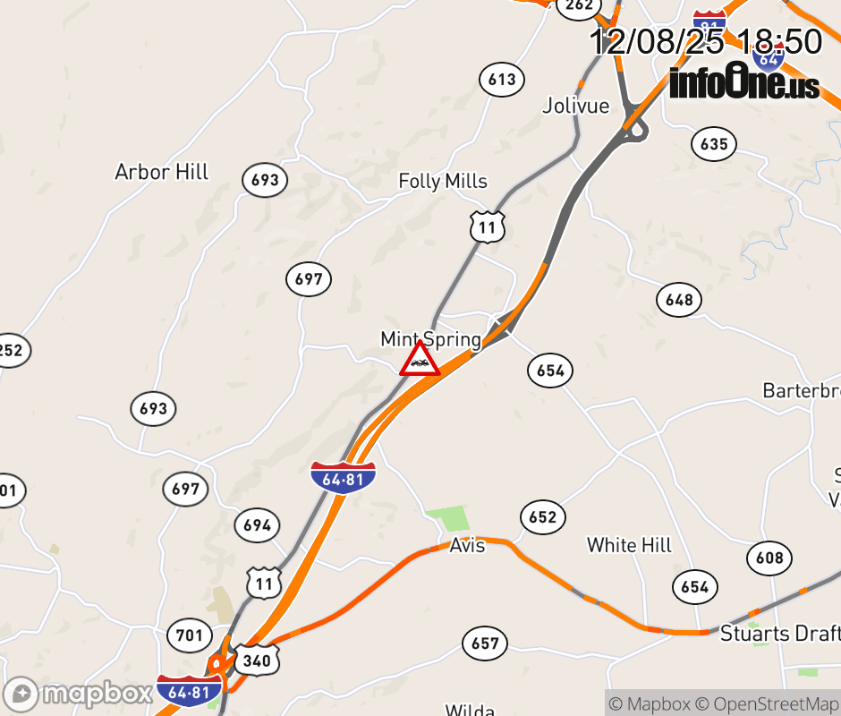 On US-11 in the County of Augusta, in the vicinity of Mint Springs Cir; Rt. 717N/S (Augusta County), motorists can expect delays due to a disabled tractor trailer. All north lanes are closed. All south lanes are closed. ![]() |