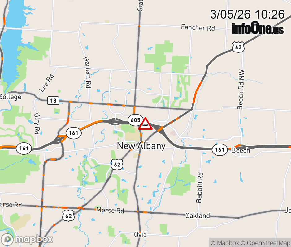 The right lane is blocked on SR-161 West beyond US-62, due to a crash. Updated: Thu 3/5/26 10:26 AM EST ![]() Updated: Thu 3/5/26 10:26 AM EST |