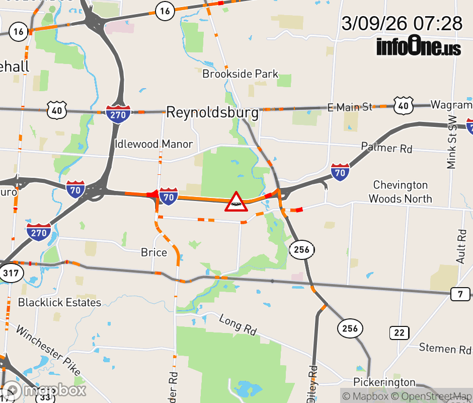 The left shoulder is blocked on I-70 West beyond SR-256, due to a crash. ![]() |