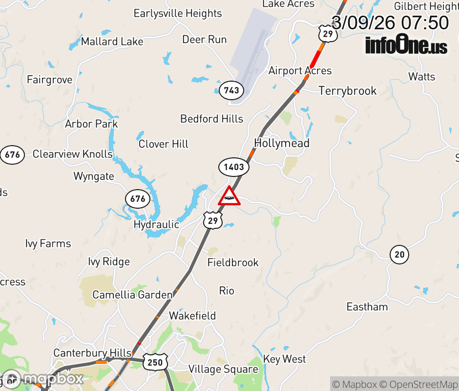 On US-29 in the County of Albemarle, in the vicinity of Crossover; Polo Grounds Rd; Rt. 643E/W (Albemarle County), motorists can expect delays due to a vehicle crash. The north right lane and right shoulder are closed. ![]() |