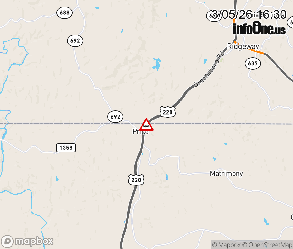 On US-220 South in the County of Franklin, in the vicinity of Doe Run South Ramp, motorists can expect delays due to a vehicle crash. Lane closures exist. ![]() |