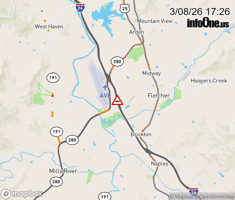 The left ramp lane to the I-26 East rest area is closed past Exit 40 (NC 280). ![]() |