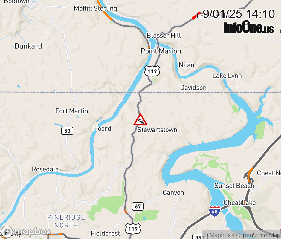 In Monongalia County there is a Vehicle Fire on US-119N at Mile Marker 21.71. Point Marion Rd & CR-119/1 (Stone Mine Rd) in Morgantown. Updated: Mon 9/1/25 2:10 PM EDT ![]() Updated: Mon 9/1/25 2:10 PM EDT |