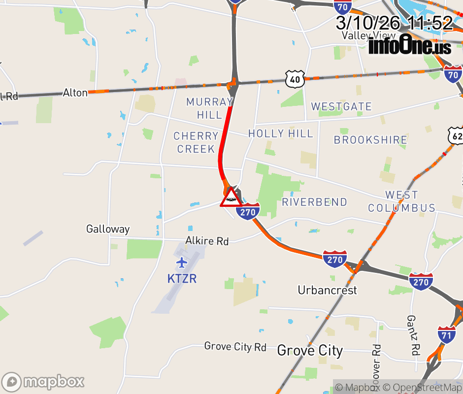 All lanes are closed on Ramp from Georgesville Rd to I-270 E, due to a crash. Updated: Tue 3/10/26 11:52 AM EDT ![]() Updated: Tue 3/10/26 11:52 AM EDT |