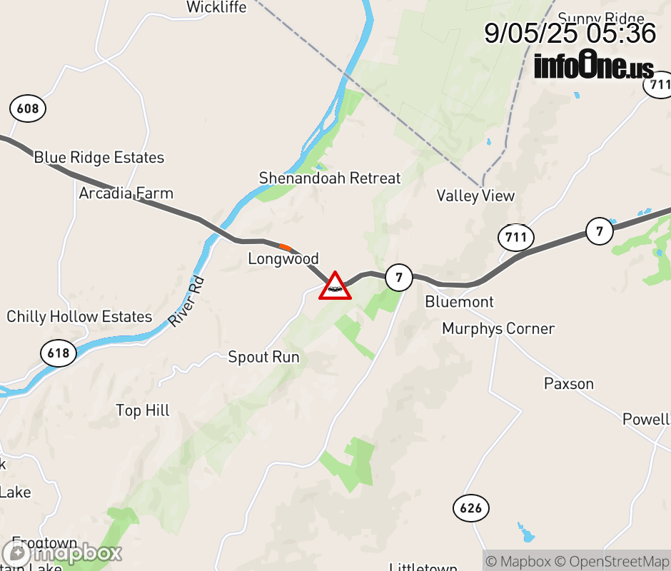 On VA-7 in the County of Clarke, in the vicinity of Ebenezer Rd; Rt. 604N/S (Clarke County), motorists can expect delays due to a vehicle crash. The east right lane and right shoulder are closed. ![]() |