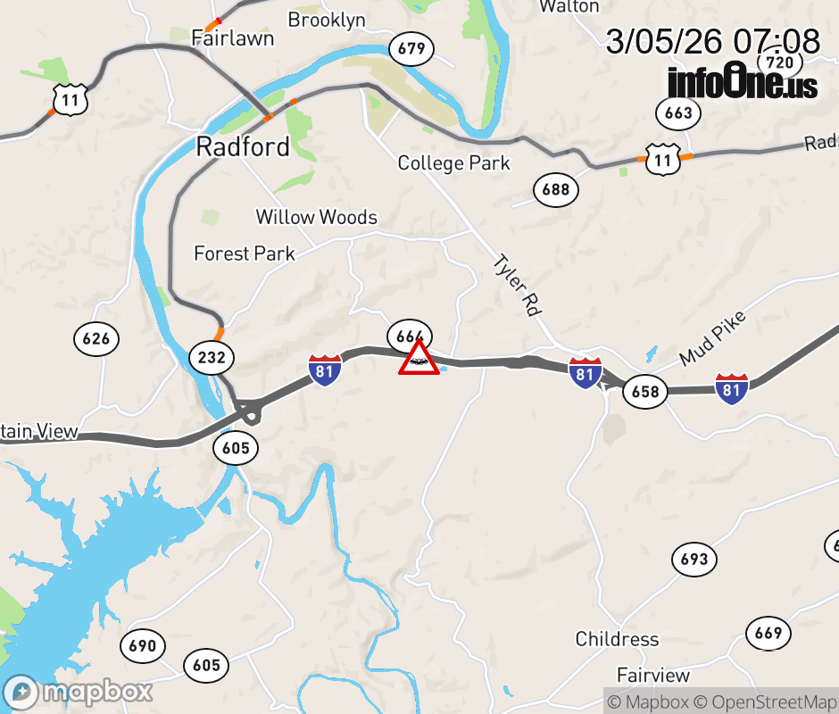 On I-81 at mile marker 107.3 in the County of Montgomery, motorists can expect delays due to a vehicle crash. The north right shoulder is closed. ![]() |