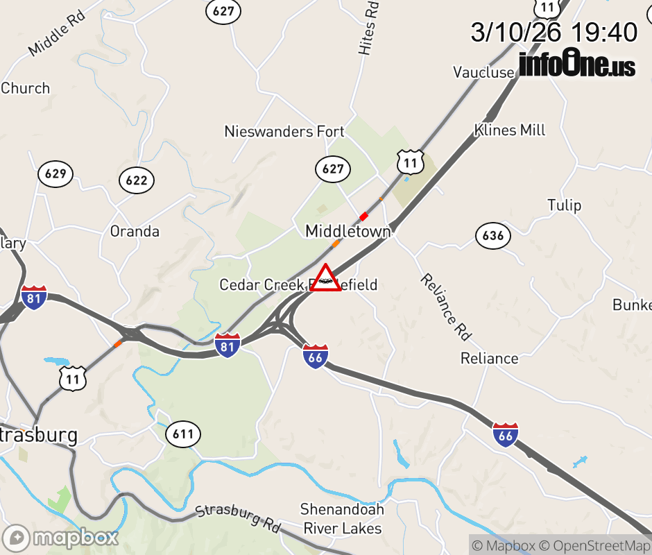 On I-81 at mile marker 301.3 in the County of Frederick, motorists can expect delays due to a tractor trailer crash. The south right shoulder is closed. Updated: Tue 3/10/26 7:40 PM EDT ![]() Updated: Tue 3/10/26 7:40 PM EDT |