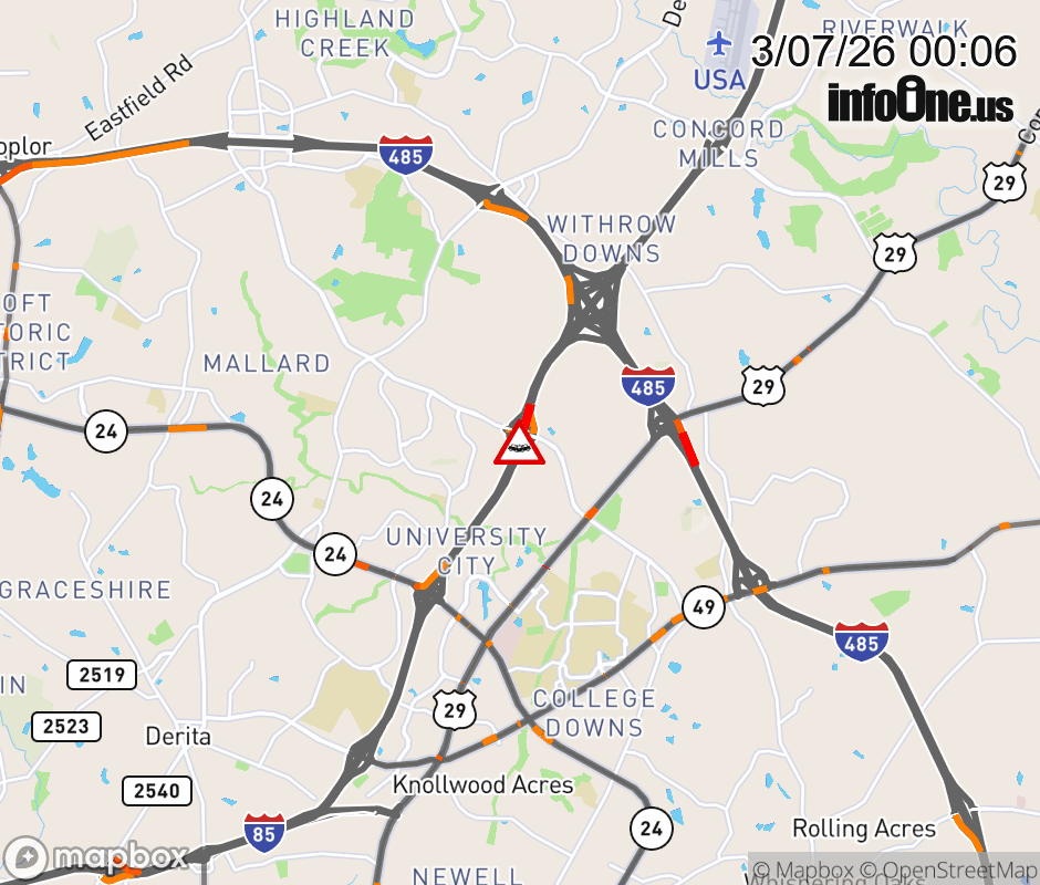 The two left lanes are closed at Exit 46 A (W Mallard Creek Church Rd). Updated: Sat 3/7/26 12:06 AM EST ![]() Updated: Sat 3/7/26 12:06 AM EST |