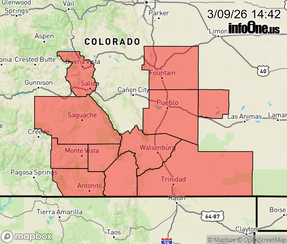 Canceled 3/9/26 7:00 PM Red Flag Warning issued March 9 at 12:40PM MDT until March 9 at 7:00PM MDT by NWS Pueblo CO * AFFECTED AREA... Fire Weather Zones 224, 227, 228, 229, 230 and 231. * WINDS... West 10 to 20 mph with gusts up to 30 mph. * RELATIVE HUMIDITY... As low as 8 percent. * IMPACTS... Fires will catch and spread quickly. Exercise extreme caution with any outdoor burning. ![]() |