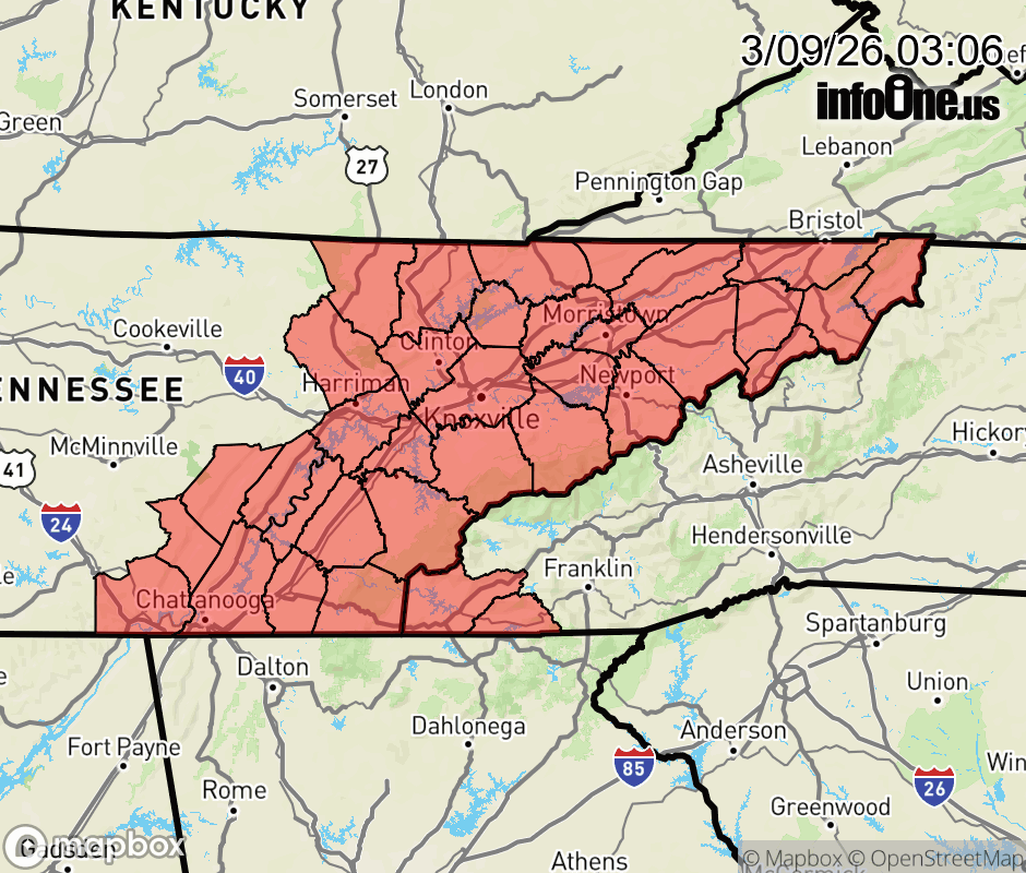 Canceled 3/9/26 10:00 AM Dense Fog Advisory issued March 9 at 3:05AM EDT until March 9 at 10:00AM EDT by NWS Morristown TN * WHAT... Visibility one quarter mile or less in dense fog. * WHERE... Portions of southwest North Carolina and East Tennessee. * WHEN... Until 10 AM EDT /9 AM CDT/ this morning. * IMPACTS... Low visibility could make driving conditions hazardous. ![]() |