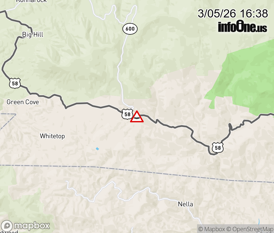 On US-58 East in the County of Grayson, in the vicinity of Mud Creek Rd; Rt. 600N/S (Grayson County), motorists can expect delays due to a vehicle crash. Lane closures exist. ![]() |