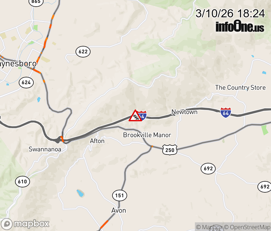 On I-64 at mile marker 102.4 in the County of Albemarle, motorists can expect delays due to a brush fire. The east right lane and right shoulder are closed. Updated: Tue 3/10/26 6:24 PM EDT ![]() Updated: Tue 3/10/26 6:24 PM EDT |