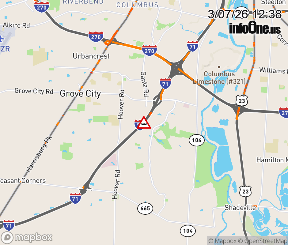 Expect lane closures on I-71 North beyond SR-665/London - Groveport Rd, due to a crash. Updated: Sat 3/7/26 12:38 PM EST ![]() Updated: Sat 3/7/26 12:38 PM EST |
