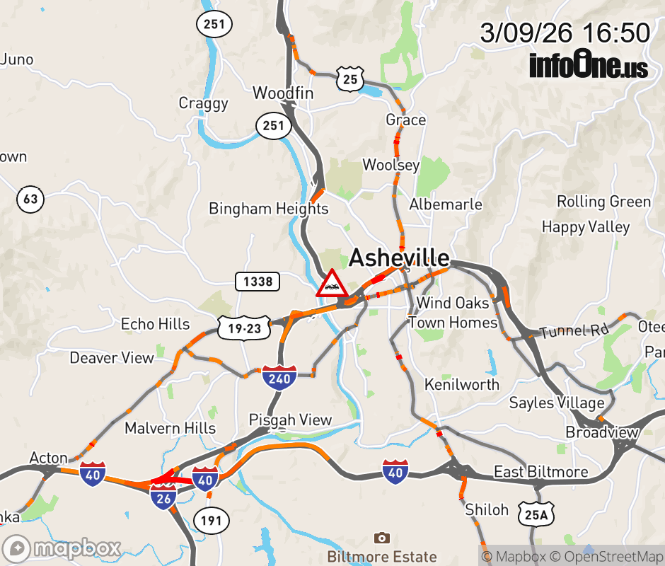 The right lane is closed 1 mile past Exit 25, NC 251 (Riverside Drive). Updated: Mon 3/9/26 4:50 PM EDT ![]() Updated: Mon 3/9/26 4:50 PM EDT |