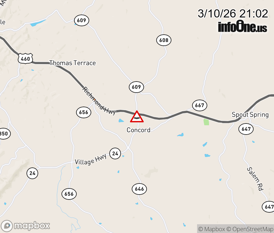 On VA-24 in the County of Campbell, in the vicinity of Richmond Hwy; Village Hwy; US-460E; Rt. 608E/W (Appomattox County), VA-24W, motorists can expect delays due to a multi-vehicle crash. All east lanes are closed. Updated: Tue 3/10/26 9:02 PM EDT ![]() Updated: Tue 3/10/26 9:02 PM EDT |
