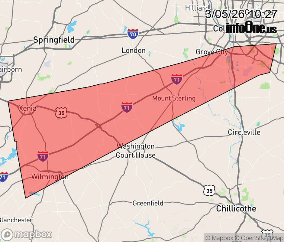 Canceled 3/5/26 1:36 PM Flood Advisory issued March 5 at 10:26AM EST until March 5 at 2:30PM EST by NWS Wilmington OH * WHAT... Flooding caused by excessive rainfall continues. * WHERE... The following counties, in central Ohio, Fayette, Franklin, Madison and Pickaway. In southwest Ohio, Clinton. In west central Ohio, Greene. * WHEN... Until 230 PM EST. * IMPACTS... Minor flooding in low-lying and poor drainage areas. * ADDITIONAL DETAILS... - At 1026 AM EST, local law enforcement reported minor flooding in the advisory area. Between 2 and 2.5 inches of rain have fallen. Additional rainfall amounts of 0.5 to 1 inch are possible. - Some locations that may experience flooding include... Columbus, Beavercreek, Grove City, Xenia, Pickerington, Wilmington, Canal Winchester, Groveport, Cedarville, Sabina, Jamestown, Mount Sterling, Jeffersonville, Bloomingburg, Wilberforce, Obetz, New Jasper, Commercial Point, Lithopolis and South Solon. ![]() |