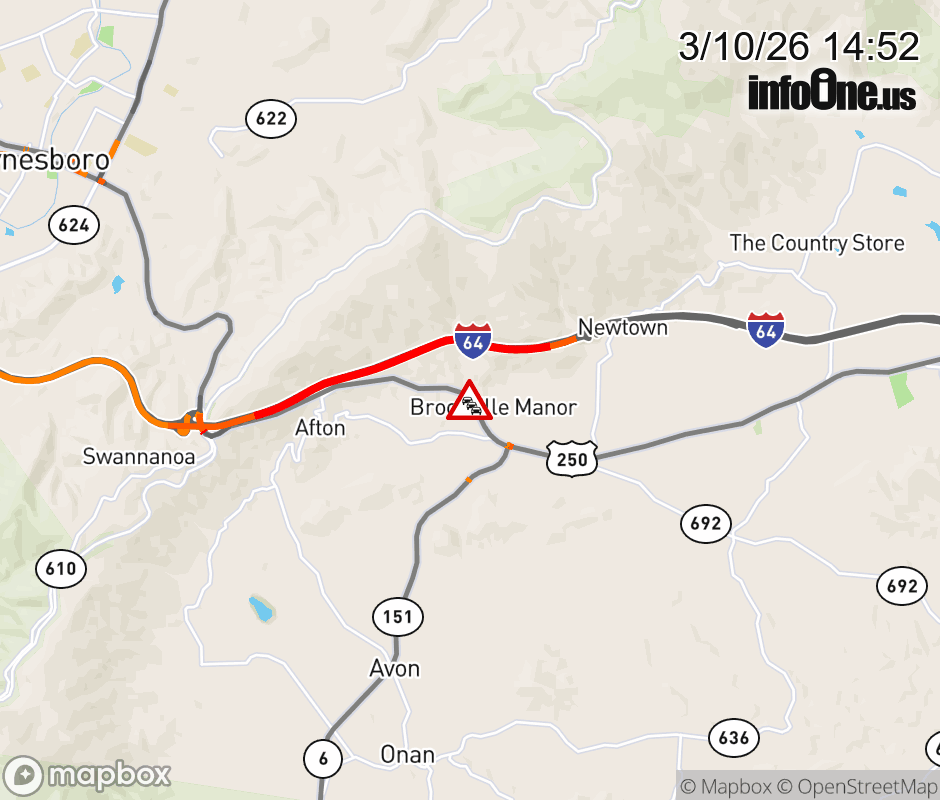On US-250 in the County of Albemarle, in the vicinity of Old Turnpike Rd; Rt. 750E/W (Albemarle County), motorists can expect delays due to a brush fire. All west lanes are alternating closures. Updated: Tue 3/10/26 2:52 PM EDT ![]() Updated: Tue 3/10/26 2:52 PM EDT |