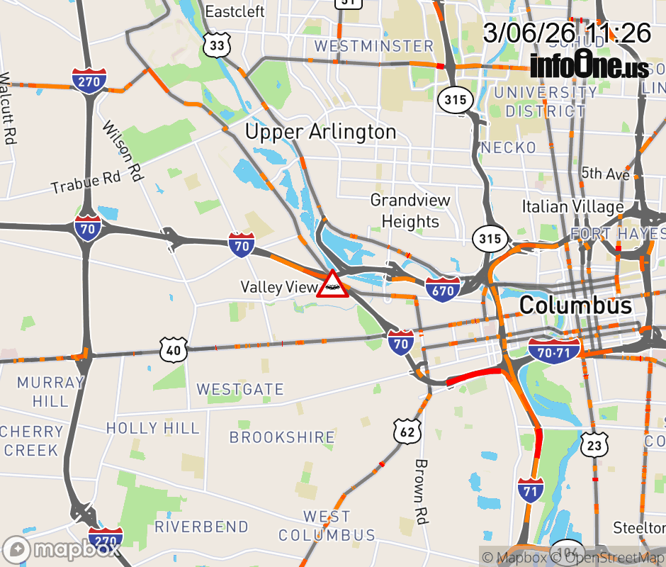 All lanes are closed on I-70 East beyond I-670 East, due to a crash. Updated: Fri 3/6/26 11:26 AM EST ![]() Updated: Fri 3/6/26 11:26 AM EST |