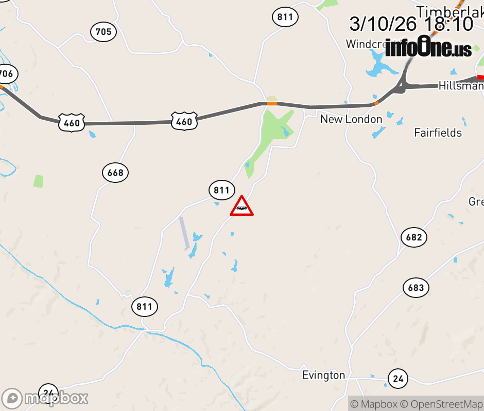 On Rt. 711 North in the County of Bedford, in the vicinity of Evington Rd; Rt. 811N/S (Bedford County), motorists can expect delays due to a vehicle crash. Updated: Tue 3/10/26 6:10 PM EDT ![]() Updated: Tue 3/10/26 6:10 PM EDT |