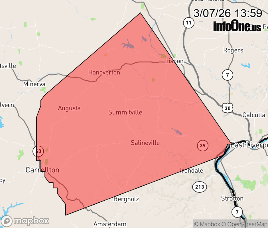Canceled 3/7/26 2:07 PM Severe Thunderstorm Warning issued March 7 at 1:58PM EST until March 7 at 2:30PM EST by NWS Pittsburgh PA At 158 PM EST, a severe thunderstorm was located over Carrollton, moving northeast at 40 mph. HAZARD...60 mph wind gusts and quarter size hail. SOURCE...Radar indicated. IMPACT...Hail damage to vehicles is expected. Expect wind damage to roofs, siding, and trees. Locations impacted include... Wellsville, Carrollton, Lisbon, Augusta, Salineville, Hanoverton, Irondale, Summitville, Mechanicstown, Guilford Lake State Park, New Garden, Winona and Harlem Springs. ![]() |