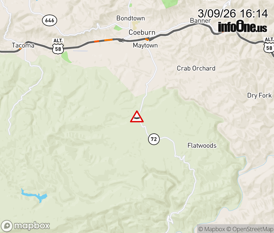 On VA-72 in the County of Wise, in the vicinity of Jaybird Branch Rd; Rt. 663E/W (Wise County), motorists can expect delays due to a vehicle crash. All north lanes are closed. ![]() |