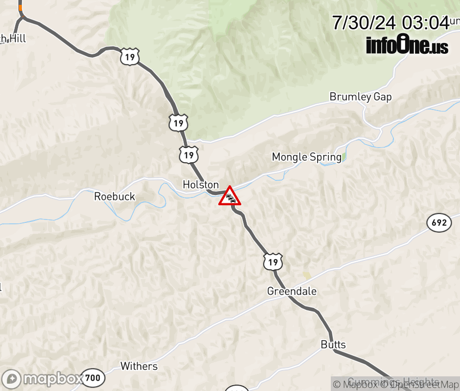 On ALT US-58 in the County of Washington, in the vicinity of Garrett Creek Rd; Rt. 611N/S (Washington County), motorists can expect delays due to weather. All east lanes are closed. All west lanes are closed.. ![]() |